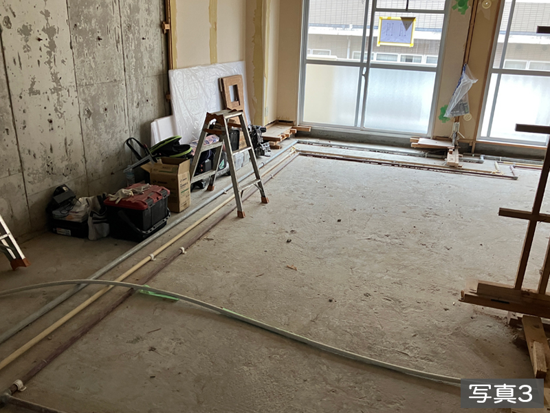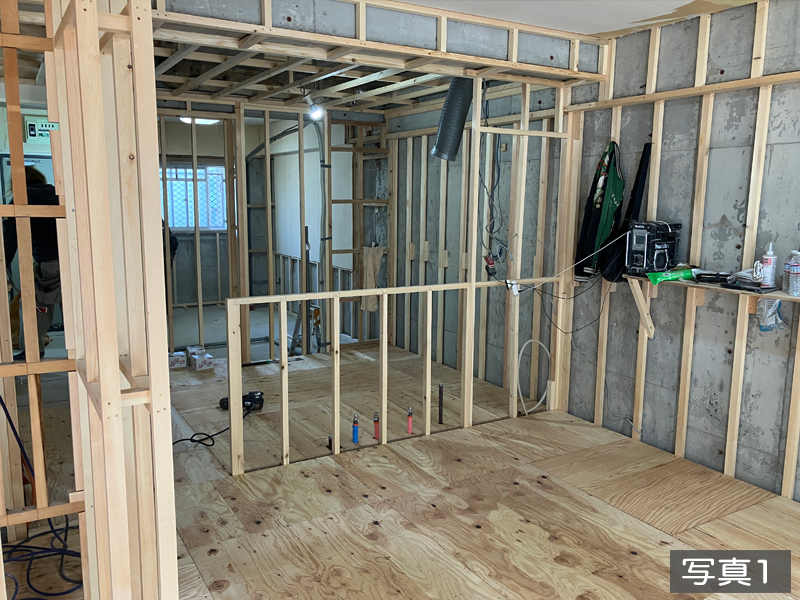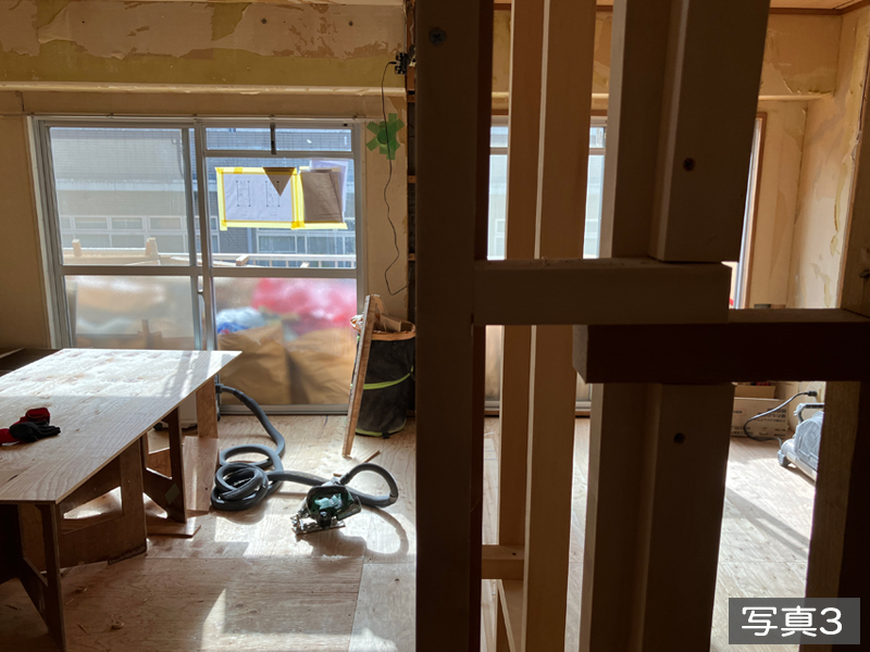 今回の施工事例は、リノベーションの流れをわかりやすいように何回かに分けてご紹介します。この物件は当社が既存の木枠などが出た状態のまま買取り、フルリノベーション施工を行いました。