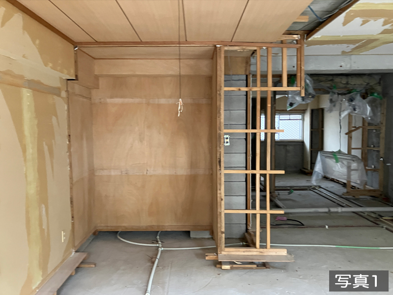 ○写真1 和室○写真2 リビングと和室のパーティションも解体○写真3 リビング○写真4 トイレ本体解体